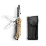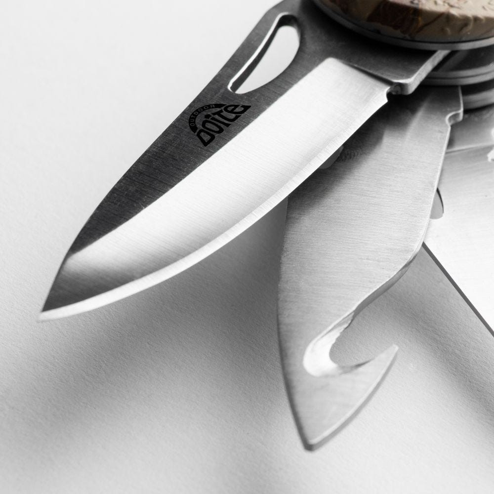 Cortapluma plegable con filo de acero inoxidable y múltiples funciones para utilizarlo en distintas ocasiones. Incluye un forro para mayor seguridad al guardar.